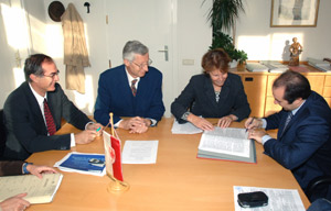 LR Werner Frick, Generaldirektor Adolf Auckenthaler, Maria Larcher vom Vertragsamt des Landes und der Vertreter des Bankenpools, Marino Binetti (v.l.n.r.).