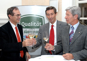 Das neue Gesetz will für land- und ernährungswirtschaftliche Produkte ein hohes Qualitätsniveau erreichen und sichern. Die Qualität der Produkte wird von einer unabhängigen Prüfeinrichtung kontrolliert. Zur Familie der „geprüften Qualität aus Südtirol“ gehören die Südtiroler ggA-Produkte wie Speck und Äpfel, der Stilfser Käse, die Südtiroler Qualitätsweine und freilich auch jene Produkte, die das jetzt genehmigte neue Qualitätszeichen tragen werden. Das sind Milch, Brot, Grappa, Apfelsaft, Honig, Gemüse und Beeren. Alle diese Produkte werden in Abstimmung mit den neuen Instrumenten der Dachmarke eingesetzt: die Weine und Südtiroler ggA-Produkte aufgrund ihres EU-Schutzes mit der Dachmarke, die anderen Produkte mit dem neuen Südtiroler Qualitätszeichen, das die Dachmarke integriert hat. „Entscheidend ist, dass es sich bei all diesen Produkten um eine gesicherte und kontrollierte Qualität handelt, sagten die drei Landesräte und stießen mit einem Glas Südtiroler Sekt auf die Verschmelzung von Qualitätsprodukten mit dem neuen Qualitätszeichen an.