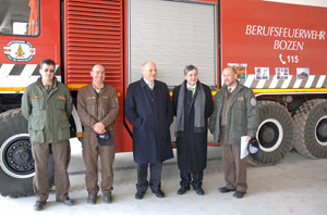 Haben sich vom Baufortschritt überzeugt: LH Durnwalder und LR Mussner mit den Männern der Berufsfeuerwehr
