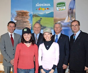 Landeshauptmann Luis Durnwalder, die Landesräte Hans Berger, Werner Frick und Thomas Widmann gratulierten den erfolgreichen Damen heute bei einem Empfang in Bozen. Die Politiker zeigten sich sehr gut informiert. Kein Wunder: Landeshauptmann Durnwalder ist in der Landesregierung für den Sport zuständig, Handelslandesrat Frick, in dessen Zuständigkeitsbereich das Qualitätszeichen fällt, war langjähriger Sportfunktionär beim SSV Bozen und Tourismuslandesrat Widmann sowie Landwirtschaftslandesrat Berger sind ausgebildete Skilehrer. Die Politiker unterhielten sich mit Weissteiner und Rungger – Tschurtschenthaler war verhindert – über ihre Trainingspläne und die nächsten sportlichen Ziele.