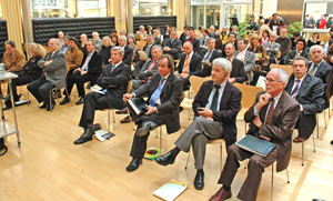 Großes Interesse am Apfelpapier: ganz rechts in der ersten Reihe der Erfinder, Alberto Volcan