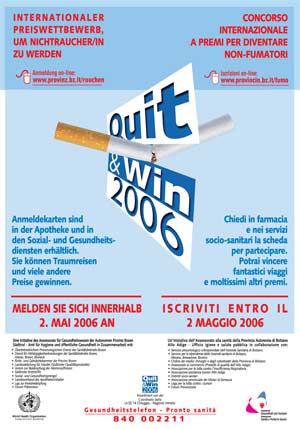 Aus diesem Grund startet man im April in die neue, mittlerweile fünfte Auflage des unter der Schirmherrschaft der Weltgesundheitsorganisation WHO stehenden Wettbewerbs, und zwar in nicht weniger als 100 Ländern weltweit. In Südtirol wird "Quit & Win" vom Landesgesundheitsressort in Zusammenarbeit mit den verschiedensten Gesundheitseinrichtungen vorangetrieben. Sie geben den erwachsenen Rauchern die Möglichkeit, sich zum Wettbewerb anzumelden, indem die entsprechenden Anmeldescheine ausgefüllt werden, die in den Apotheken, Sprengeln und im Südtiroler Bürgernetz (www.provinz.bz.it/rauchen) zu finden sind. Mit der Anmeldung verpflichten sich die (Ex-)Raucher, vier Wochen lang unter Aufsicht eines Zeugen nicht zur Zigarette zu greifen, und zwar vom 2. bis zum 29. Mai.