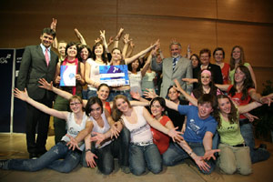 In Siegerpose: Die Schüler des Pädagogischen Gymnasiums Bruneck mit Bildungslandesrat Koler (hinten) und Hannes Gruber von der Hypo Tirol Bank.