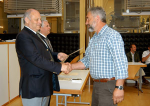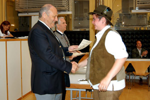 Einer von 163 frisch gebackenen Jägern nimmt den Jagdbefähigungsnachweis aus den Händen LH Durnwalders entgegen.