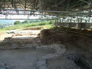 Die wertvollen Mosaikböden werden bis zur endgültigen Konservierung mit einem Wellblechdach geschützt.