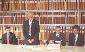 Die Hauptbuchära beendet: LR Berger (stehend) mit (v.l.) Alfred Vedovelli (Inspektorat für das Grundbuch), Abteilungsdirektor Gänsbacher und Amtsdirektor Gius