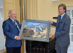 LPA – Das Ölgemälde „ Der Schafhirte vor Schloss Tirol“ von Thomas Riss wird demnächst im Landesmuseum für Kultur- und Landesgeschichte Schloss Tirol zu sehen sein. Am heutigen frühen Nachmittag (Montag, 7. Mai) nahm der Verwaltungsratspräsident von Schloss Tirol, Landeshauptmann Luis Durnwalder, im Palais Widmann in Bozen das Gemälde aus den Händen des Präsidenten der Stiftung Sparkasse, Gerhard Brandstätter, als Dauerleihgabe für das Landesmuseum entgegen.