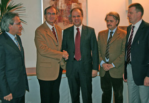 Zusammenarbeit besiegelt: (v.l.) Eros Magnago, Direktor der Landesabteilung Finanzen, LR Frick, Sanzò, Costantino Serangeli und Fernando Bettega, Direktor des Landesamts für Abgaben
