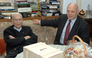 Als Geschenk zum 94. Geburtstag hat der Landeshauptmann seinem Vorgänger heute einen Korb mit Südtiroler Qualitätsprodukten und eine Lagrein-Auswahl der Laimburg mitgebracht.