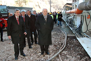 LPA - Landeshauptmann Luis Durnwalder und Bautenlandesrat Florian Mussner haben am heutigen Dienstag, 19. Februar, am Eingang ins Sarntal den Startschuss für die Bohrungsarbeiten für Probestollen für einen neuen Tunnel gegeben. Vor Ort waren auch die Landesräte Hans Berger und Werner Frick. Die Sarntaler Staatsstraße soll durch zwei weitere neue Tunnel, die zusammen 48 Millionen Euro kosten, sicherer gemacht werden.