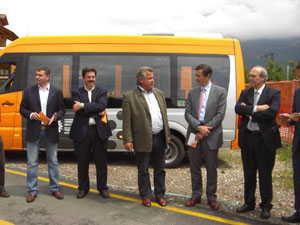 Neuer Linienbus vorgestellt: (v.l.) Daniel D'Amico, Vize-BM von Branzoll, der Leiferer Stadtrat Bruno Ceschini, Georg Forti, Vize-BM Leifers, LR Widmann, Mauro Bertoldi, Präsident der SASA