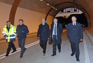 LPA - Noch in diesem Jahr werden die ersten Fahrzeuge durch den neuen Tunnel „Castelfeder“ rollen. Dass die Arbeiten für das erste Baulos der fast drei Kilometer langen und rund 70 Millionen Euro teuren Umfahrung von Auer vor dem Abschluss stehen, davon überzeugte sich heute Nachmittag (23. Dezember) Landesrat Florian Mussner.