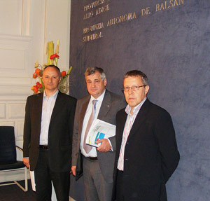 Bautenlandesrat Florian Mussner (Mitte) mit den Bürgermeistern von Auer, Roland Pichler (links), und Neumarkt, Alfred Vedovelli (rechts).