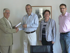 Spenden übergeben: (v.l.) Walter Stifter, Benno Röggla, Landesmusikschuldirektorin Irene Vieider, Musiklehrer Meinhard Windisch, Initiator der Spendenaktion