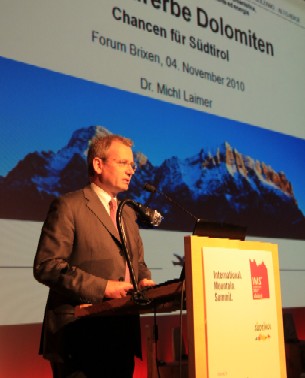 "In die Welterbeliste aufgenommen zu werden ist die höchste Auszeichnung für eine Landschaft. Mit dieser Anerkennung spielen wir in der ersten Liga mit. Der IMS-Congress ist eine optimale Gelegenheit, das Juwel UNESCO Welterbe Dolomiten einem breiten Interessentenkreis zu präsentieren", erklärte Landesrat Michl Laimer in seinem einleitenden Statement zum Kongresstag.