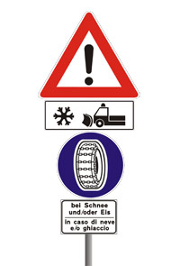 "Es genügt nicht, eine solche Regelung zu erlassen, sie muss den Autofahrern auch - das ist Vorschrift - zur Kenntnis gebracht werden", erklärt Paolo Montagner, Direktor des Landesstraßendienstes. Demnach sind entlang aller Staats- und Landesstraßen entsprechende Hinweisschilder angebracht worden. Diese bestehen aus einer Kombination vier einzelner Schilder: dem Gefahrenzeichen, einem Zeichen mit einer Schneeflocke und einem Schneepflug, einem Gebotsschild, das einen Reifen mit Schneekette zeigt, sowie dem Schild mit der Aufschrift "bei Schnee oder Eis".