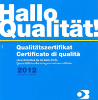 Ein Schritt auf dem Weg zu diesem gemeinsamen Dach ist die Qualitätsprüfung. Über ein Zertifizierungs-Verfahren auf der Grundlage einer Qualitätsprüfung von außen, wird erhoben, ob die einzelne Bibliothek bestimmte Qualitätsstandards erfüllt. Als 50. Bibliothek im Land hat nun jene von Nals dieses Verfahren durchlaufen und das Qualitäts-Zertifikat erworben. Das Zertifizierungs-Verfahren wurde von einer Steuerungsgruppe entwickelt, in der Vertretende verschiedenen Bibliotheksarten, des Bibliotheksverbands Südtirol und des Landesamtes für Bibliotheken und Lesen zusammen gearbeitet haben.