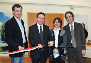 Gemeinsam mit der Leiferer Bürgermeisterin Liliana Di Fede hat der italienische Schullandesrat Tommasini (2.v.li.) den provisorischen Sitz der italienischen Berufsschule für Obst-, Wein- und Gartenbau in Leifers eröffnet.