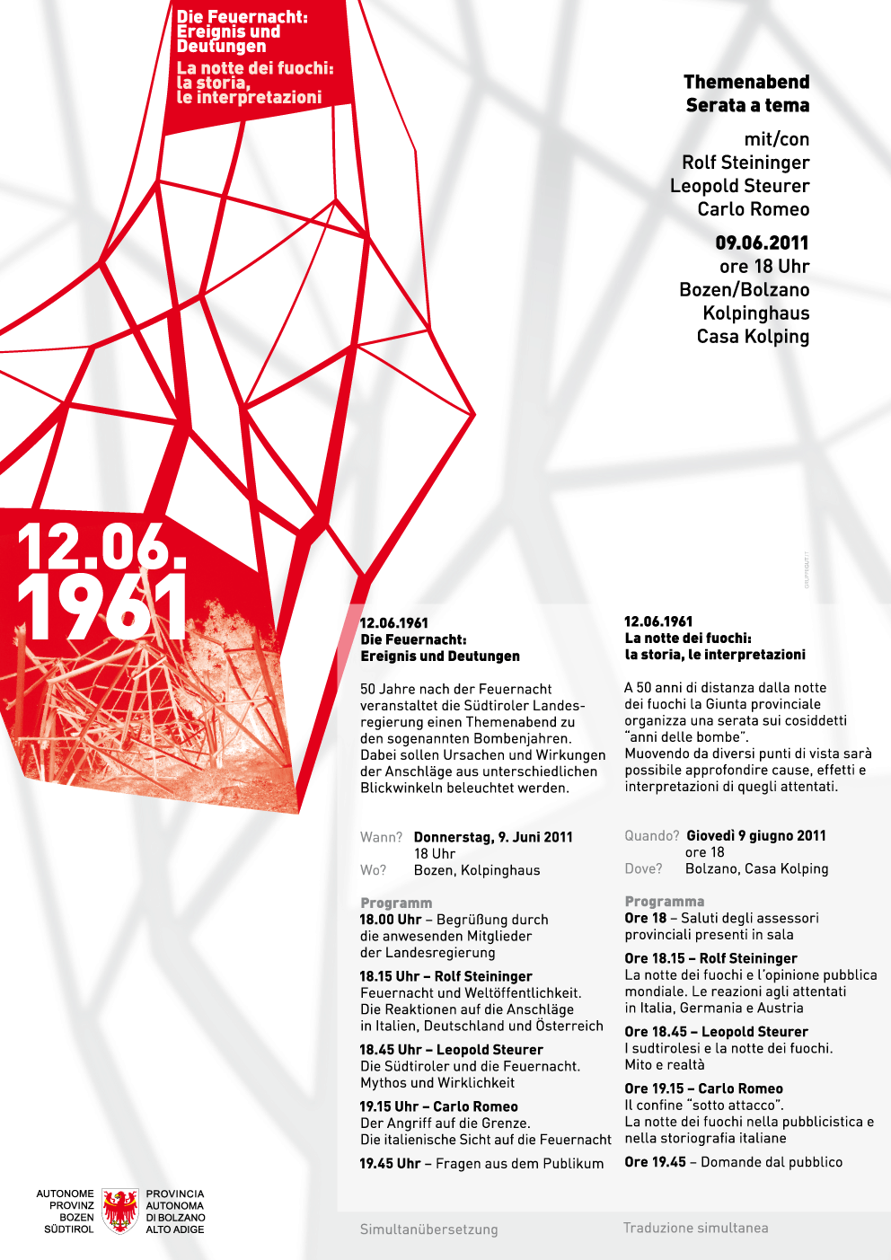 50 Jahre nach der Feuernacht veranstaltet die Landesregierung übermorgen Donnerstag, 9. Juni im Bozner Kolpinghaus (Beginn 18 Uhr) einen Themenabend zu den Südtiroler Bombenjahren. Dabei werden Ursachen und Wirkungen der Anschläge aus unterschiedlichen Blickwinkeln von den Historikern Rolf Steininger, Leopold Steurer und Carlo Romeo beleuchtet.