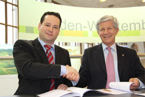 Alexander Bonde, Minister für ländliche Entwicklung und Verbraucherschutz des Landes Baden-Württemberg und Landesrat Hans Berger bei der Unterzeichnung des Rahmenabkommens zur Vernetzung mit Baden-Württemberg