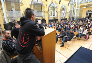 Nach den Ansprachen von Alessandro Huber (Terra del Fuoco), Sergio Bonagura (Arciragazzi) und Karlheinz Malojer (AGJD) erinnerte Claudio Andolfo vom Jugenddienst des italienischen Kulturressorts, die Jugendlichen daran, dass sie der Motro für Veränderungen seien. „Es ist wichtig, dass es verantwortungsbewusste Jugendliche gibt, die die Gesellschaft verändern können und es ist Aufgabe der Kulturressorts ihnen das Werkzeug dafür zur Verfügung zu stellen“, sagte Andolfo. Der Direktor des Landesamts für Jugendarbeit Klaus Nothdurfter las die bewegenden Erinnerungen an die Erlebnisse mit dem „Zug der Erinnerungen“ von Simone, einer der Teilnehmerinnen des Bildungsprojekts im Vorjahr vor. ANPI-Präsident Lionello Bertoldi wünschte den Jugendlichen, dass sie mit Friedensgedanken von ihrer Reise zurückkehren.