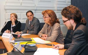 LRin Kasslatter Mur, Stefan Planker vom Museum Ladin (l.), der Ethnologe und Antropologe Emanuel Valentin (r.) und Projektleiterin Renata Meazza bei der heutigen Vorstellung