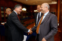 Landeshauptmann Luis Durnwalder (rechts) und Europaminister Rocco Buttiglione sind mit dem Ergebnis der zweistündigen Sitzung zufrieden.