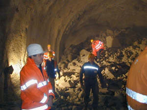 Landesrat Florian Mussner (links) bei der Besichtigung der Tunnelbauarbeiten.