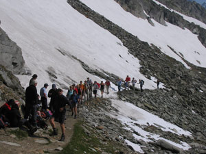 Der Aufstieg über den Tauernweg war für alle ein besonderer Einstieg in diese Zweitageswanderung, hat er doch eine jahrhundertealte Geschichte. Über den Krimmler Tauern „ging“ der historische Warenverkehr nach Salzburg, mit Saumpferden und auf den Schultern der Tauernträger. Das eindrucksvolle Panorama ließ die Anstrengungen beim Aufstieg vergessen und auf dem Krimmler Tauern in 2633 Meter Höhe traf man dann auf die Wandergruppe aus dem Oberpinzgau. Der Verantwortliche für den Salzburger Anteil am Nationalpark Hohe Tauern, Hans Lerch, ließ es sich nicht nehmen, jeden einzeln zu begrüßen. Der Abstieg durchs Windbachtal war zunächst eher eine Rutschpartie, bei der es hieß „Gamaschen anschnallen und hinunter“ über zahlreiche Schneefelder. Den Wanderern gefiel’s, auch wenn sich ein paar nasse Füße holten.
