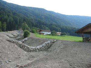 Um den auf einem Schwemmkegel gelegenen Hof und die Eisenbahnlinie dauerhaft vor Muren zu schützen, war Amtsdirektor Sandro Gius nach den Ereignissen im Jahr 2002 daran gegangen, ein Projekt auszuarbeiten, mit dessen Umsetzung bereits im Herbst 2003 begonnen werden konnte. Unter der Leitung von Vorarbeiter Markus Passler haben die Arbeiter im Unterlauf des Kaserbaches ein Ausschotterungsbecken gebaut, das an die 1000 Kubikmeter Murmaterial zurückhalten soll. Die Bachsohle wurde mit Konsolidierungssperren aus Stahlbeton gesichert. „Die Sperren sind vorne mit Zyklopensteinen verkleidet, damit sie sich besser ins Landschaftsbild einfügen“, erklärt Gius. Die Arbeiten im Unterlauf wurden vor wenigen Tagen abgeschlossen.