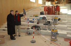 LPA - Das Herzstück der Freien Universität in Bozen, die sechs neuen Hörsäle, wird in einigen Wochen fertig sein. Derzeit laufen die letzten Bauarbeiten. Bautenlandesrat Florian Mussner hat sich am heutigen Donnerstag, 13. Januar 2005, gemeinsam mit Projektsteurer Hans Peter Santer ein Bild von den neuen Räumen gemacht. Eine Besonderheit ist die Teleteaching-Anlage, welche die Vorlesungen renomierter Dozenten von anderen Universitäten via Bildschirm in Echtzeit in die Hörsäle der Uni Bozen überträgt.