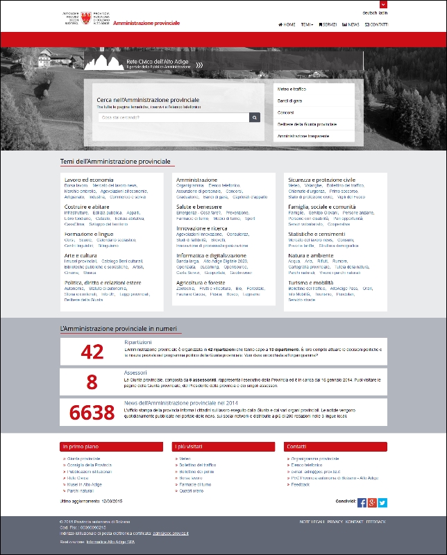 "Il progetto - sottolinea l'assessora all'amministrazione Waltraud Deeg - si inserisce all'interno della nostra strategia di sviluppo Alto Adige digitale 2020, e punta a sfruttare le enormi potenzialità delle tecnologie dell'informazione e della comunicazione per semplificare e migliorare i servizi di un'amministrazione che deve essere sempre più attenta alle esigenze dei cittadini e allineata ai più moderni standard di qualità". Dalla fine del mese di marzo, dunque, la Rete Civica, che rimarrà come portale di tutto il settore pubblico locale, compreso il Consorzio dei Comuni, le Comunità comprensoriali e l'Azienda sanitaria, si trasferirà all'indirizzo www.retecivica.bz.it, mentre il tradizionale e ormai conosciutissimo www.provincia.bz.it sarà utilizzato esclusivamente dalla Provincia, come richiesto da Roma per ottemperare a esigenze di carattere giuridico.