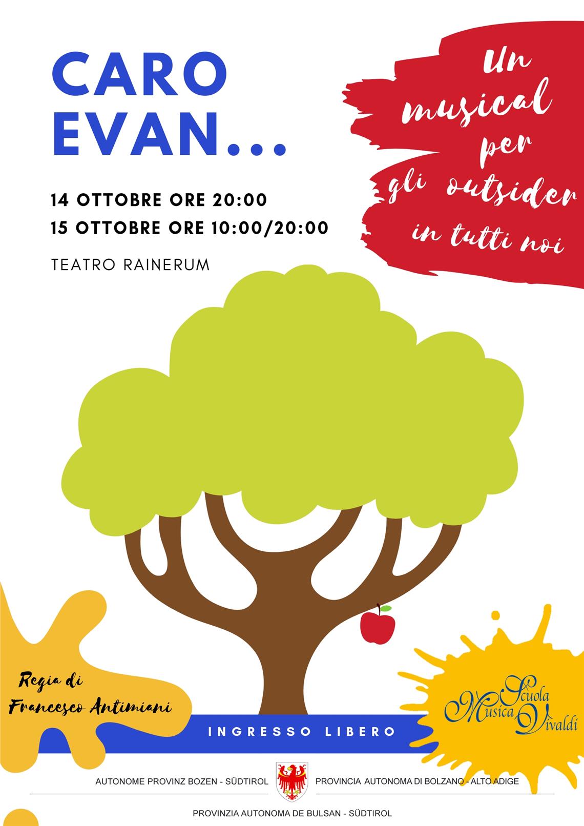 Dopo il grande successo ottenuto con i musical prodotti negli scorsi anni scolastici, la Scuola di musica Vivaldi, ripropone il musical Caro Evan, relizzato dagli allievi del Vivaldi con la regia del professor Francesco Antimiani, che ha anche tradotto il testo. Lo spettacolo tocca temi importanti come la fobia sociale, che molti scambiano per timidezza o asocialità, ma in realtà è un disturbo che provoca ansia e non permette al malato di relazionarsi con gli altri nemmeno tramite semplici gesti. Quindi, per chi ne soffre anche andare a scuola risulta complicato.
