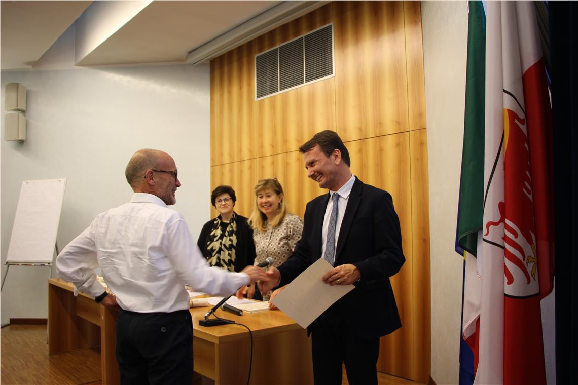 Per 67 docenti della scuola italiana è arrivato il momento della pensione. L’assessore alla scuola italiana Giuliano Vettorato e il Sovrintendente Vincenzo Gullotta hanno voluto premiare e ringraziare il personale della scuola, che dall’1 settembre ha raggiunto questo meritato traguardo. Si tratta dei dirigenti scolastici Calogero Arcieri (IISS Galilei) e Mirca Passarella (Liceo Pascoli), dell’ispettore per la religione Sandro Tarter, oltre a 27 docenti delle scuole superiori, 22 della scuola secondaria di I grado e 15 della scuola primaria. "Umanamente sono felice per il traguardo raggiunto dai docenti – sottolinea l’assessore Giuliano Vettorato – professionalmente sono dispiaciuto di dover salutare delle figure, il cui grande valore professionale è stato riconosciuto da tutto l’ambiente della nostra scuola."
