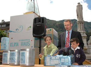 LPA - Am Bozner Walterplatz wurde heute, 5. Juli, das kleine KlimaHaus geöffnet. Von dem dort für vor vier Wochen eingeschlossenen einen Kubikmeter umfassenden Eisblock sind rund 70 Prozent übrig geblieben. Dies zeige, dass das KlimaHaus die richtige Antwort auf Klimaveränderungen sei, da es im Sommer Kühle und im Winter Wärme garantiere, freute sich Umweltlandesrat Michl Laimer. Von 1553 Teilnehmern, die bei der Eisblockwette mit ihrer Schätzung richtig lagen, wurden fünf Gewinner ermittelt. Sie können sich über Stadtfahrräder oder Energieberatungen freuen.