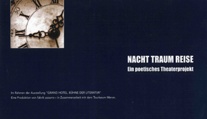 Mit „Nacht Traum Reise“ hat die Künstlervereinigung „fabrik azzurro“ unter der Leitung von Torsten Schilling ein für Südtirol einmaliges Theaterprojekt geschaffen. Genauso wie sich Literaten von jeher durch die besondere Atmosphäre ausgewählter Hotels inspirieren lassen, wird bei der Inszenierung die Faszination und das Theatralische des Hotel. Geführt vom Zauber der Texte, Bilder, Klänge und Bewegungen, unternimmt das Publikum eine Reise durch verschiedene Hotelräume, die sich zum Schauplatz eines Traumspiels verwandeln. Den poetischen Stoff für diese Collage liefern Dichter verschiedenster Epochen, deren Traumwelten und Weltträume die Nacht beflügeln. Die Mitwirkenden in Torsten Schillings Inszenierung sind Zita Pichler, Christina Khuen, Martina Marini, Eva Kuen, Dietmar Gamper und Matthias Ladurner.