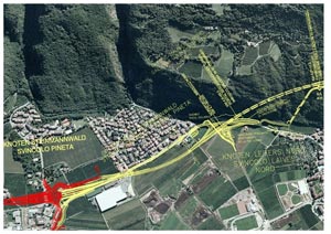 Die Arbeiten für die Umfahrung von Steinmannwald können beginnen. Der Direktor der Landesabteilung Tiefbau Valentino Pagani, der auch der Projektsteurer für das Bauvorhaben ist, hat heute dem Unternehmen „Oberosler Cav. Pietro SpA“ aus St. Lorenzen in Steinmannwald die Arbeiten für den Bau der Umfahrung offiziell übergeben. Das Unternehmen wird die Umfahrung gemeinsam mit dem Unternehmen „EDIL Passiria Srl“ aus St. Martin in Passeier bauen. Geplant wurde der neue insgesamt neun Kilometer lange Straßenabschnitt von Georg Fischnaller. Die Umfahrung von Steinmannwald ist ein weiteres Teilstück der Umfahrungsstrasse von St. Jakob bis Branzoll und somit eines der größten Straßenbauprojekte des Landes. Vorgesehen ist eine freie rund 950 Meter lange Trasse westlich der bestehenden Brennerstaatsstraße, die dann in den 2,9 Kilometer langen Tunnel zur Umfahrung der Stadt Leifers führt. So ist eine direkte Verbindung zwischen dem nördlichen Teil von Leifers und der Umfahrung möglich, ohne über den Abschnitt von Steinmannwald fahren zu müssen. Ursprünglich war ein Tunnel geplant gewesen, den die Bürger aber ablehnten.