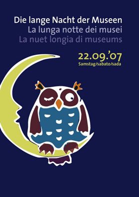 LPA - Nach dem Motto „Von wegen nachts sind nur Eulen unterwegs“ findet am Samstag, 22. September 2007 wieder die "Lange Nacht der Museen" statt. Insgesamt 27 Museen vom Vinschgau bis ins Pustertal, vom Wipptal bis ins Überetsch öffnen in den Abendstunden ihre Tore und werden ihre Ausstellungen und Museumsschätze in einer stimmungsvollen Atmosphäre präsentieren.