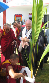 Gemeinsam mit dem Dalai Lama pflanzte LH Durnwalder vor dem mit Südtiroler Hilfe errrichteten Schülerheim eine Palme