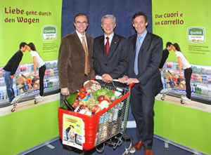 LPA - Mit dem Slogan „Liebe geht durch den Wagen“ und einer neuen Kampagne wollen die Landesräte Werner Frick, Hans Berger und Thomas Widmann die Bürger einladen, mehr Lebensmittel aus Südtirol mit dem Qualitätszeichen zu kaufen. Das Qualitätszeichen bürge nämlich für kontrollierte und besonders hohe Qualität sowie für sichere Südtiroler Herkunft, die die kleinen Wirtschaftskreisläufe im Lande stärke, unterstrichen Frick, Berger und Widmann.