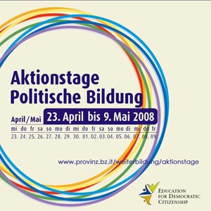 Erstmals finden von morgen, 23. April, bis 9. Mai die "Aktionstage Politische Bildung" in Südtirol statt, die das Landesamt für Weiterbildung gemeinsam mit dem deutschen Pädagogischen Institut organisiert hat. Unter dem gemeinsamen Dach des interkulturellen Dialogs soll eine Reihe von Aktionen und Veranstaltungen geboten werden, die - auch dank des gebündelten Auftritts - auf die Bedeutung der politischen Bildung in demokratischen Gesellschaften aufmerksam machen soll. Angeboten werden über 60 Initiativen, die von klassischen Weiterbildungsangeboten, also etwa Vorträgen, Kursen oder Seminaren, über Filmvorführungen und Buchvorstellungen bis hin zu interkulturellen Kochabenden sowie Tanz-, Musik- und Theaterworkshops reichen.