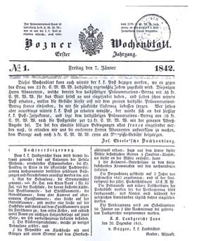 Erste Ausgabe der „Bozner Zeitung“ vom 07.01.1842, damals noch unter dem Titel „Bozner Wochenblatt“