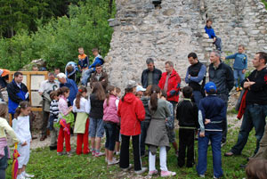 Sie sind die Zielgruppe des Oswald-von-Wolkenstein-Wegs: Die Kinder, die hier LR Laimer lauschen