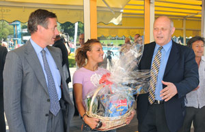 LH Durnwalder und LR Widmann überreichen der Turmspringerin Tania Cagnotto in Vertretung aller Südtiroler Olympiateilnehmer einen Korb mit Südtiroler Qualitätsprodukten (FOTO:LPA/Pertl)