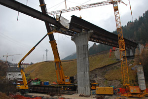 Stück für Stück, ähnlich einem Puzzle, ist die Brücke der Umfahrung von St. Christina zusammengesetzt worden. Beendet worden ist das Puzzle heute mit dem Verschweißen des bestehenden ersten, 43 Meter langen Brückenstücks mit dem noch fehlenden mit einer Länge von 29 Metern. Letzteres musste mit einem Autokran millimetergenau angehoben werden, um danach in der Luft verschweißt zu werden. Eine ohnehin bereits schwierige Aufgabe, die noch dadurch erschwert worden ist, dass die Brücke nicht gerade, sondern in einer Kurve verläuft.