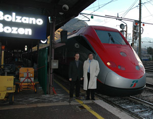 Als "Meilenstein in der Geschichte der Mobilität" hat der Landesrat heute den neuen Hochgeschwindigkeitszug "Freccia Rossa" bezeichnet, den er mit Trenitalia-Regionaldirektor Roger Hopfinger am Bahnhof Bozen unter die Lupe genommen hat. Der Zug ermöglicht Fahrgeschwindigkeiten bis zu 300 Kilometer in der Stunde, wodurch etwa die Fahrzeit von Mailand nach Bologna auf eine Stunde gedrückt wird. "Damit wird die Eisenbahn zur Konkurrenz für das Flugzeug", so Widmann.
