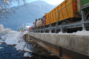 Am Donnerstag, 4. Dezember, wurde die Brücke den vorgeschriebenen Belastungstests unterzogen und dazu mit sieben voll beladenen Lkws befahren. Die Brücke trägt ohne Probleme eine Last von 33 Tonnen, heißt es aus dem Bautenressort des Landes. Ab Freitag, 5. Dezember, können die ersten Fahrzeuge über die Brücke fahren und die Ampel für die Einbahnregelung kann abgebaut werden.