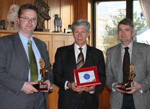 Als Produkte konnten in diesem Jahr der Stilfser Käse der Milkon sowie der Südtiroler Apfel die begehrten "Qualivita"-Trophäen einheimsen. Die Preisträger haben sich heute im Büro von Landesrat Berger getroffen: Joachim Reinalter, Obmann des Sennereiverbandes, und Georg Kössler, der neue Obmann des Verbands der Obstgenossenschaften (VOG), der dem Landesrat heute auch seinen Antrittsbesuch abgestattet hat.