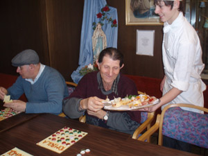 "Ernährung im Alter" war das Thema, unter das Schöpf den Abschluss seiner Ausbildung gestellt hat. Gemeinsam mit seinen Schülern und Lehrerkollegen wurden die Erkenntnisse im Bürgerheim von Schlanders in die Praxis umgesetzt, und zwar nicht nur in der Küche. Vielmehr begann der Tag im Bürgerheim für die Schüler mit dem Decken und Dekorieren der Tische im Speisesaal, während die Bewohner des Seniorenheims von der "Entertainmentgruppe" der Schüler mit einer Tombola und "Mensch ärgere dich nicht" unterhalten wurden.