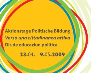 Aktionstage zur politischen Bildung sind in Deutschland, Österreich und dem deutschsprachigen Teil Belgiens bereits Tradition und genießen zunehmend Zuspruch sowohl bei den Veranstaltern als auch bei Bürgerinnen und Bürgern. Zum zweiten Mal finden in diesem Jahr Aktionstage Politische Bildung in Südtirol statt. Durch die Initiative sollen politische Bildungsarbeit sichtbar gemacht und möglichst viele Menschen zur Mitarbeit im politischen Bildungsbereich motiviert werden. Getragen wird die Initiative von den Landesämtern für Weiterbildung gemeinsam mit den drei Pädagogischen Instituten.